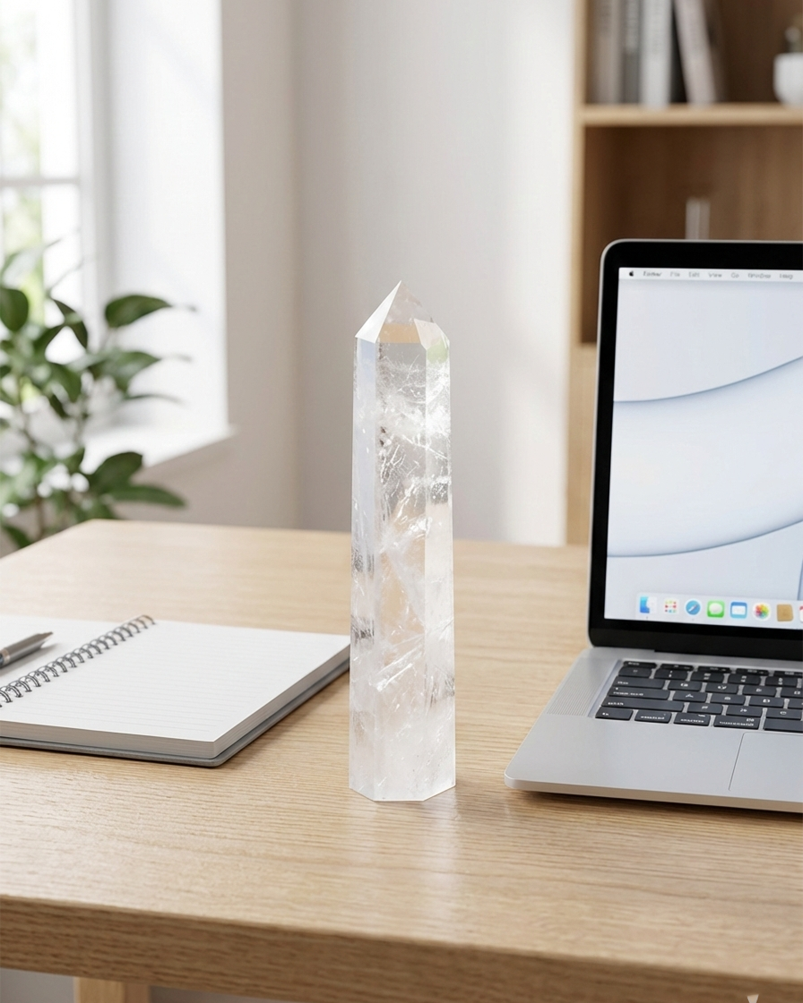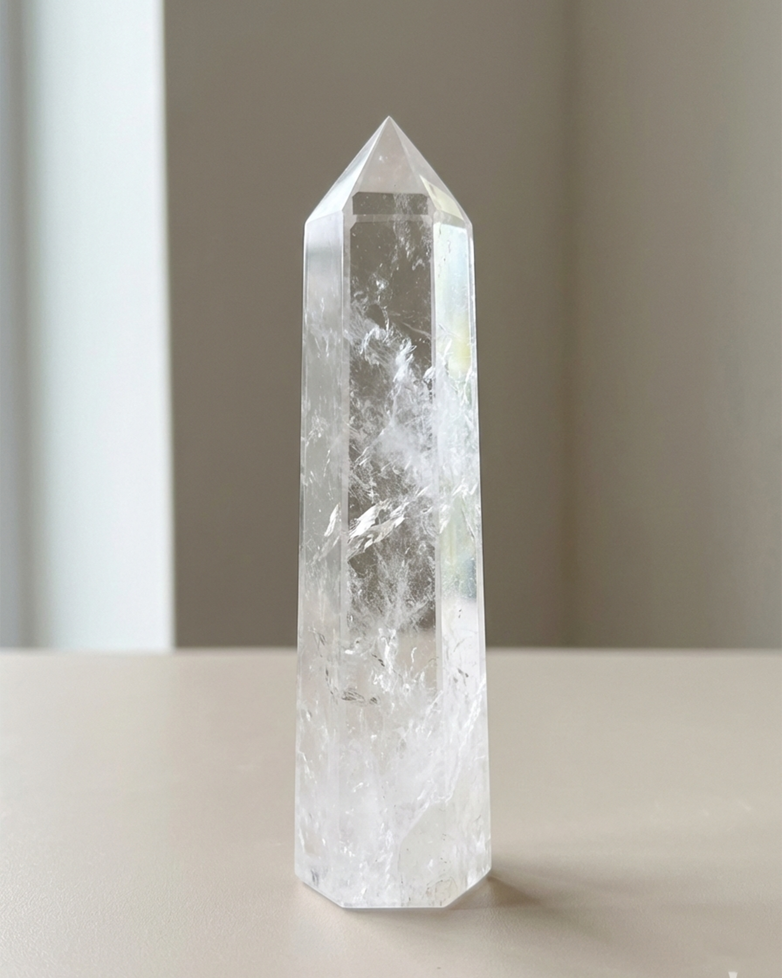 A natural clear quartz tower cut in a six-sided single-point formation to enhance mental clarity, amplify intention and direct energy. Ideal for desks, studios, meditation spaces and learning environments.