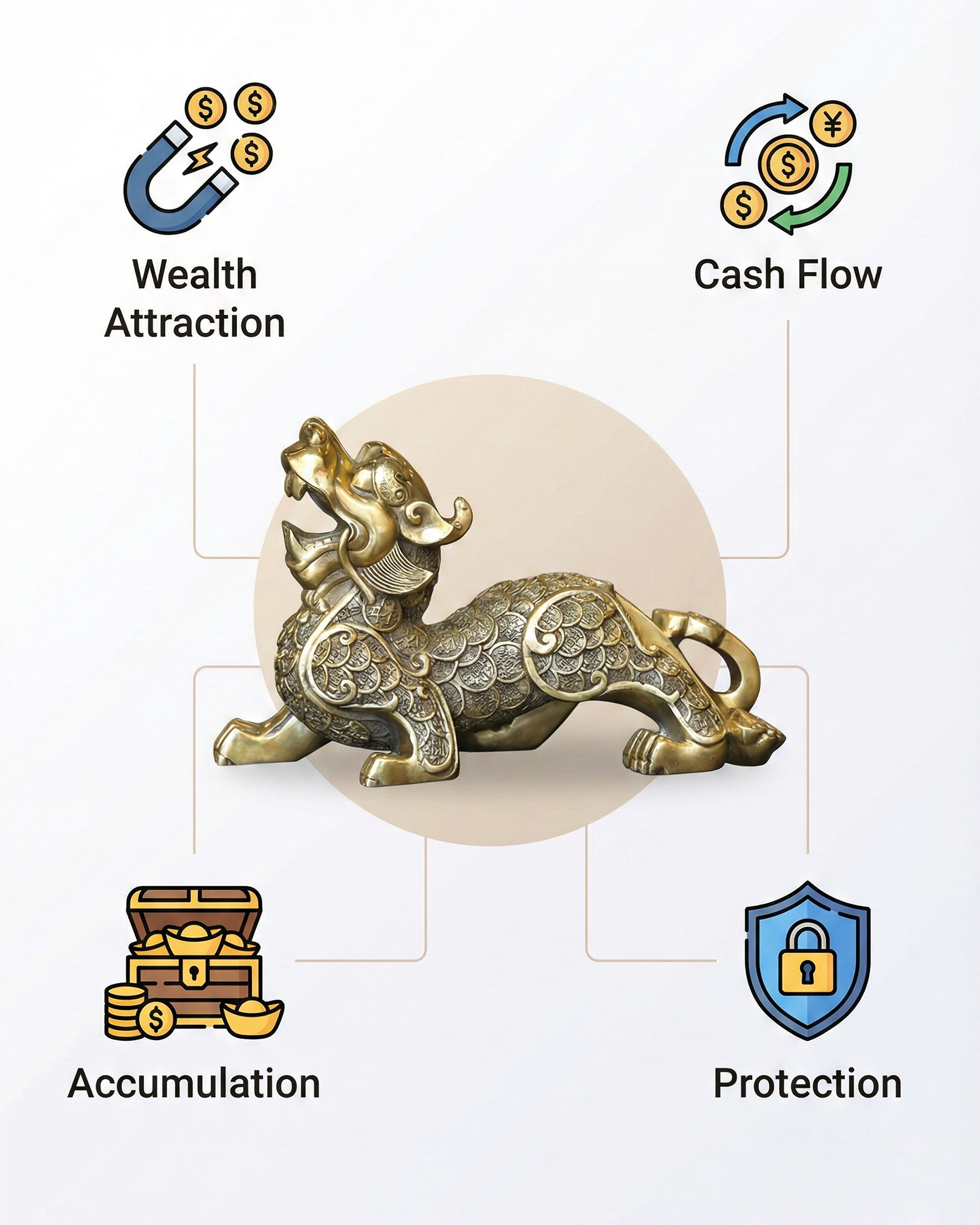 Pixiu is one of the most recognized Feng Shui wealth symbols, widely used to boost cash flow, business income and financial stability. Brass belongs to the Metal element, which generates Water — the Feng Shui element of Wealth.
