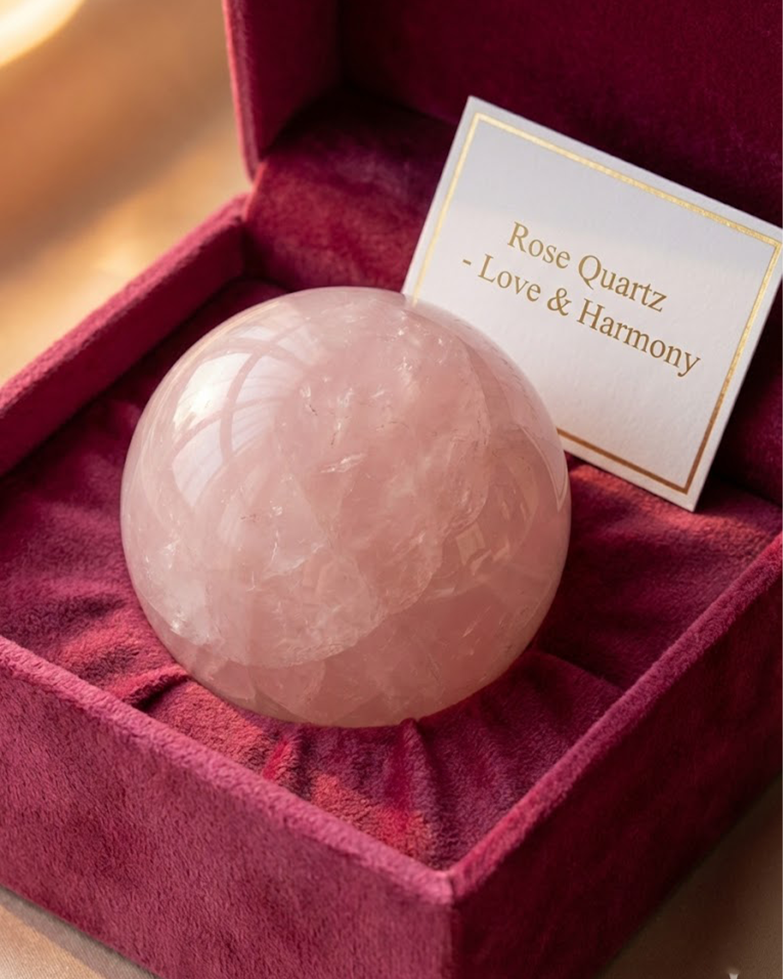 A natural rose quartz crystal sphere designed to support emotional healing, self-love and harmonious relationships. Its spherical form distributes gentle energy in all directions, making it ideal for homes, offices, studios, and personal wellness spaces.