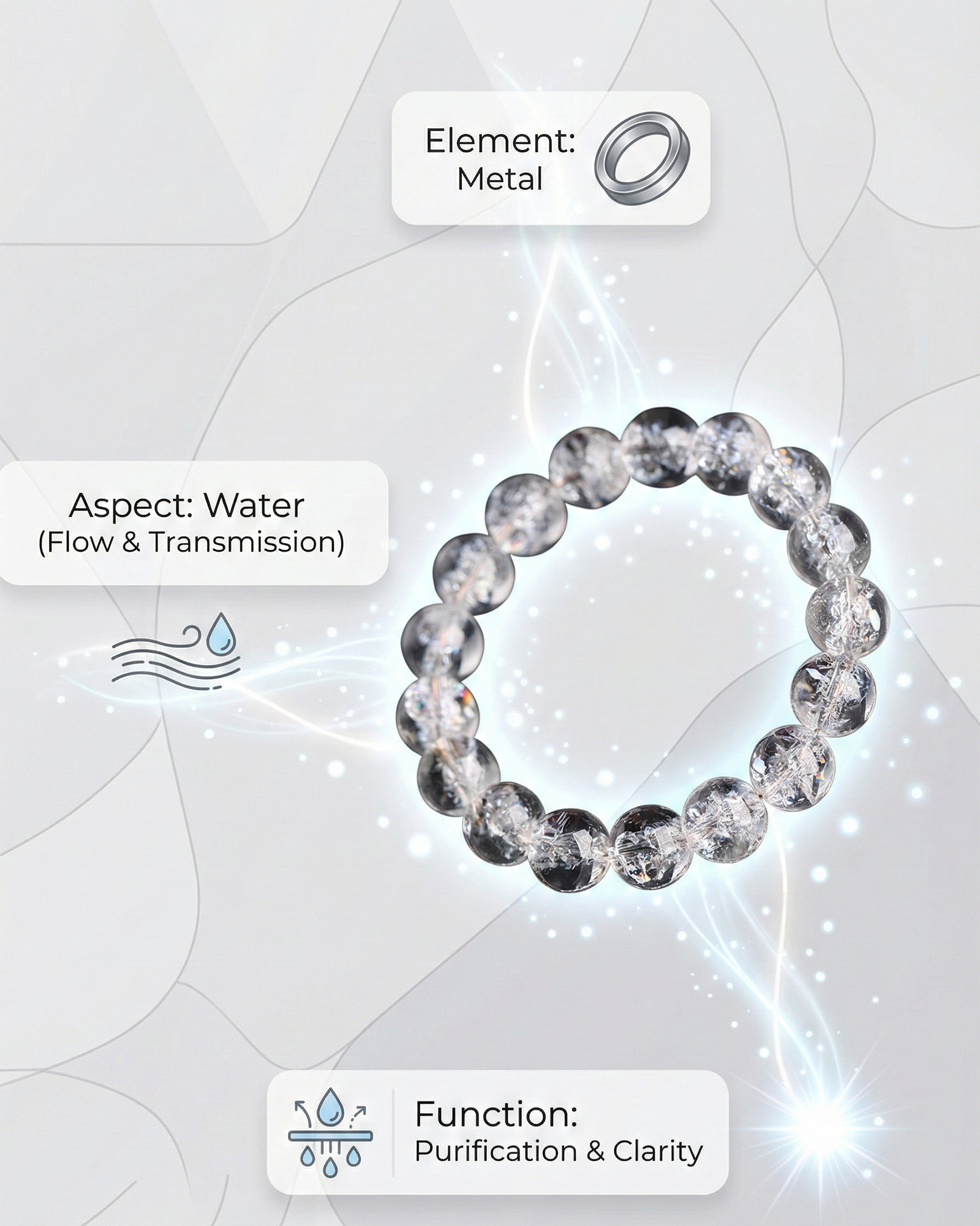 A natural clear quartz bracelet available in 10mm and 12mm beads. Clear Quartz represents the Metal Element in Feng Shui, supporting clarity, structure and energetic purification.