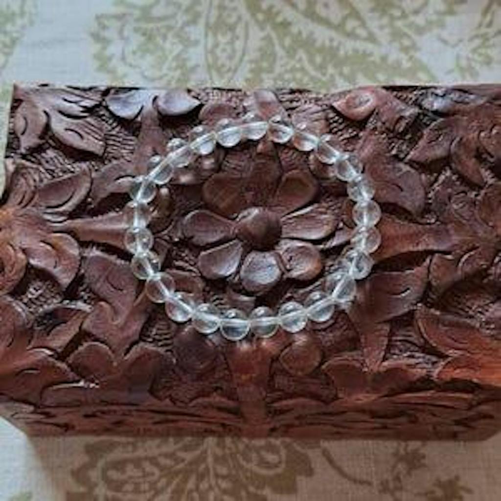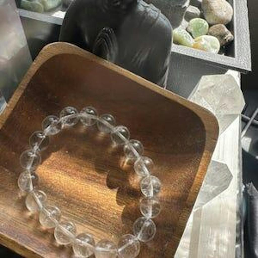 A natural clear quartz bracelet available in 10mm and 12mm beads. Clear Quartz represents the Metal Element in Feng Shui, supporting clarity, structure and energetic purification.